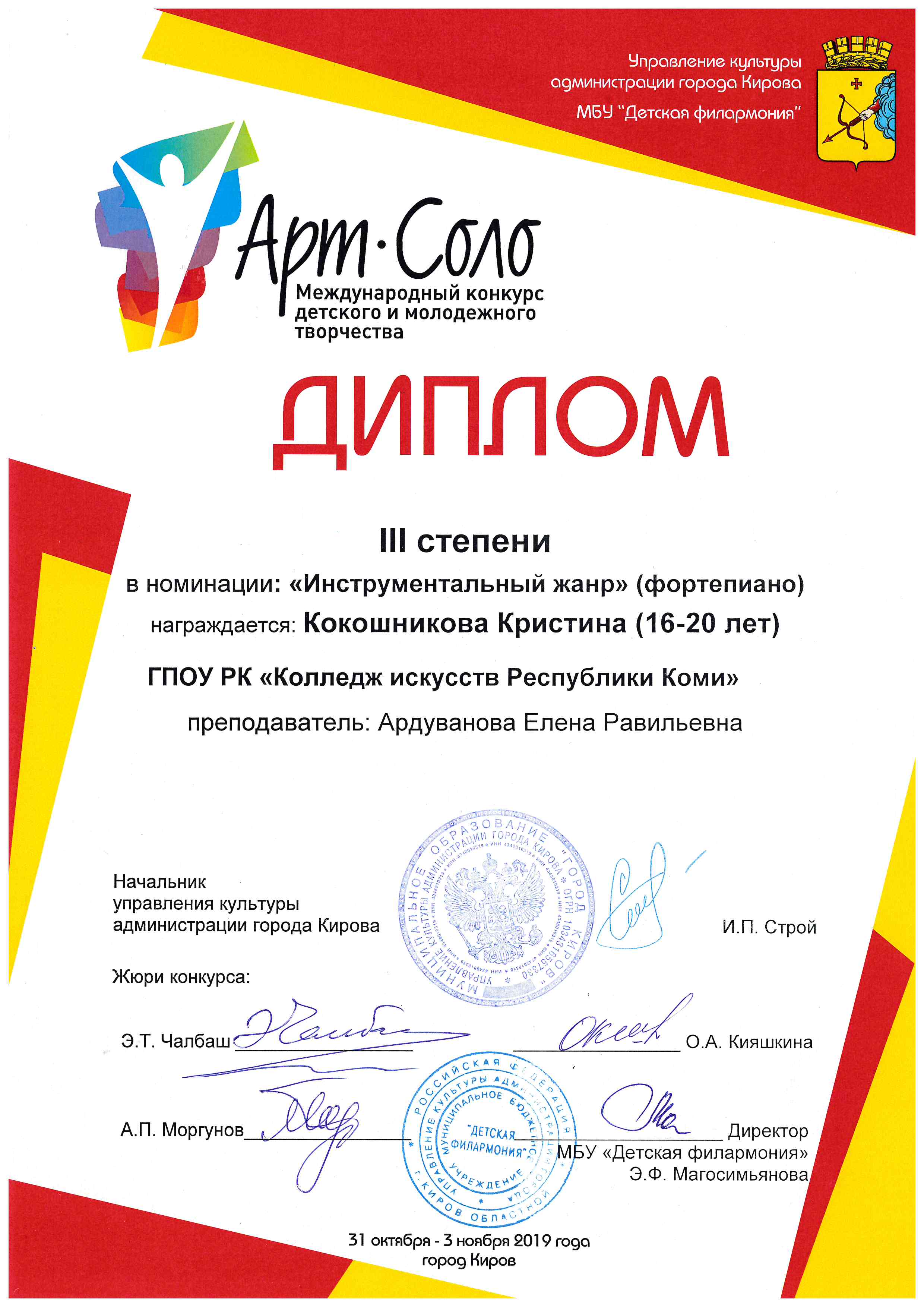 По итогам участия в Международном конкурсе детского и молодежного творчества «Арт-соло», который проходил с 31 октября по 03 ноября 2019 года в г. Кирове на базе МБУ «Детская филармония», поздравляем с успешным участием: