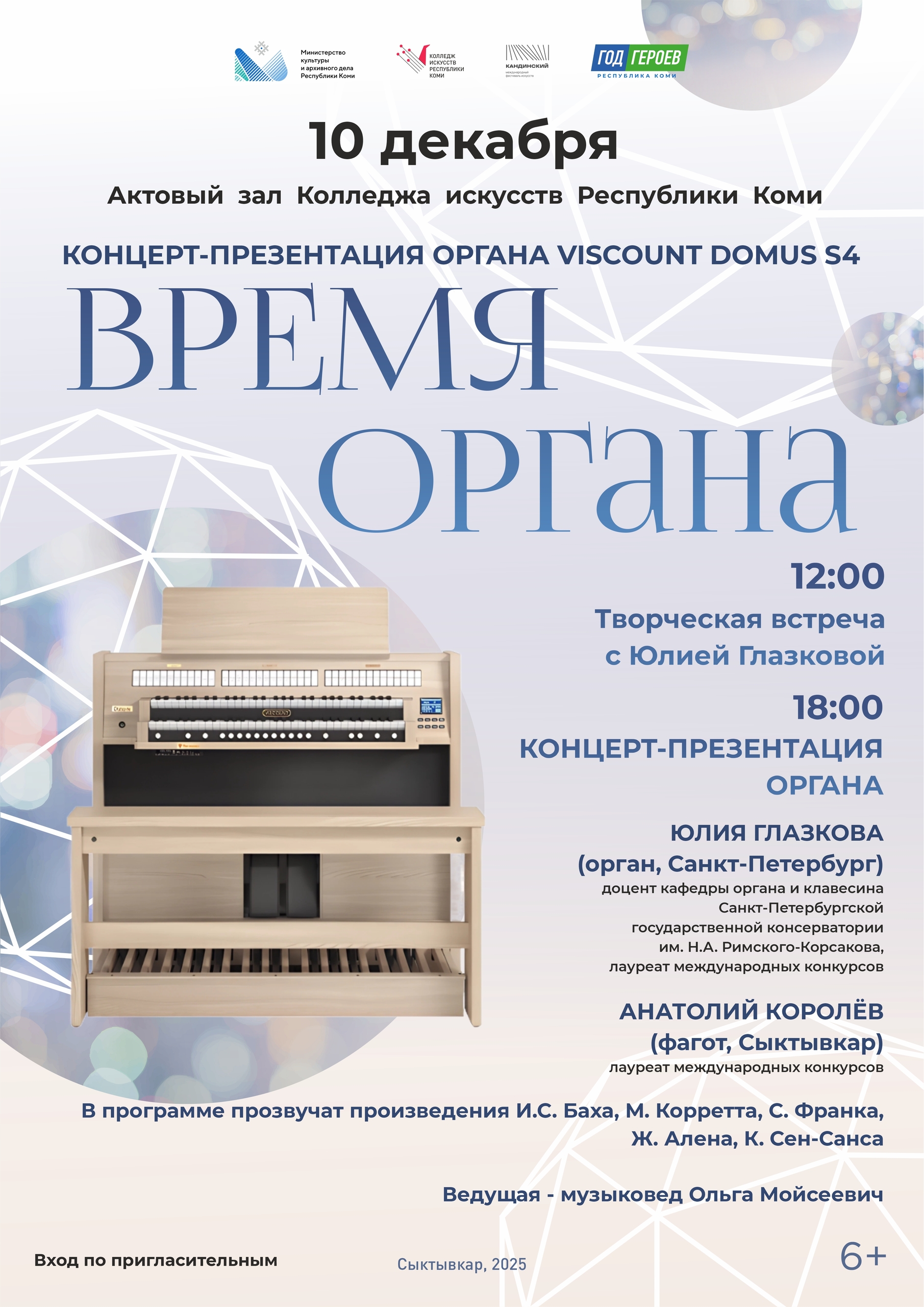 10 декабря 2025 года в 12:00 в актовом зале Колледжа искусств состоится творческая встреча с ЮЛИЕЙ ГЛАЗКОВОЙ (Санкт-Петербург), российской органисткой и педагогом, обладателем Премии за лучшее исполнение музыки И.С. Баха Канадского Международного конкурса органистов, лауреатом международных конкурсов органистов в Германии, Италии, Испании, Польше и России, доцентом кафедры органа и клавесина Санкт-Петербургской государственной консерватории им. Н.А. Римского-Корсакова, кандидатом искусствоведения.