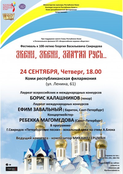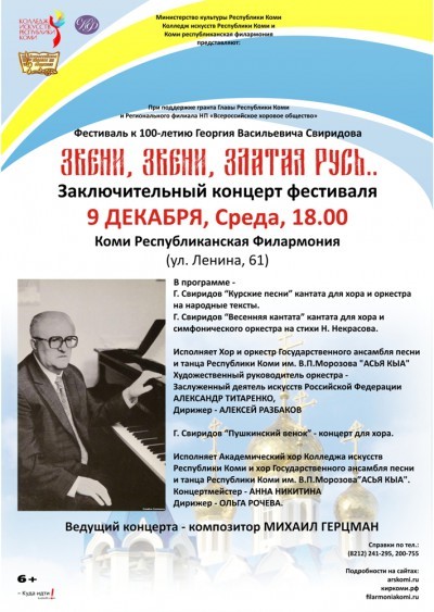 В год столетия великого музыканта Колледж искусств Республики Коми совместно с Коми республиканской филармонией и Региональным отделением Всероссийского хорового общества представили фестиваль вокальной и хоровой музыки, посвященный Георгию Свиридову. Названием проекту послужила строка из стихотворения Сергея Есенина, положенного на музыку Георгием Свиридовым – «Звени, звени, златая Русь…» И это не случайный выбор: до последнего дня своей жизни Георгий Васильевич воспевал свою страну, в самые трудные времена, оставаясь искренним патриотом России. В одном из интервью он так определил собственную композиторскую миссию: «Воспеть Русь, где Господь дал и велел мне жить, радоваться и мучиться».